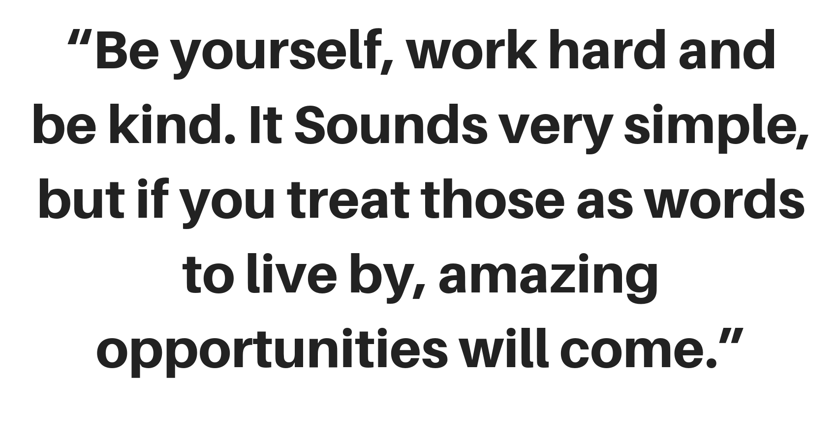 Be yourself, work hard, and be kind. It sounds very simple, but if you treat those as words to live by, amazing opportunities will come.